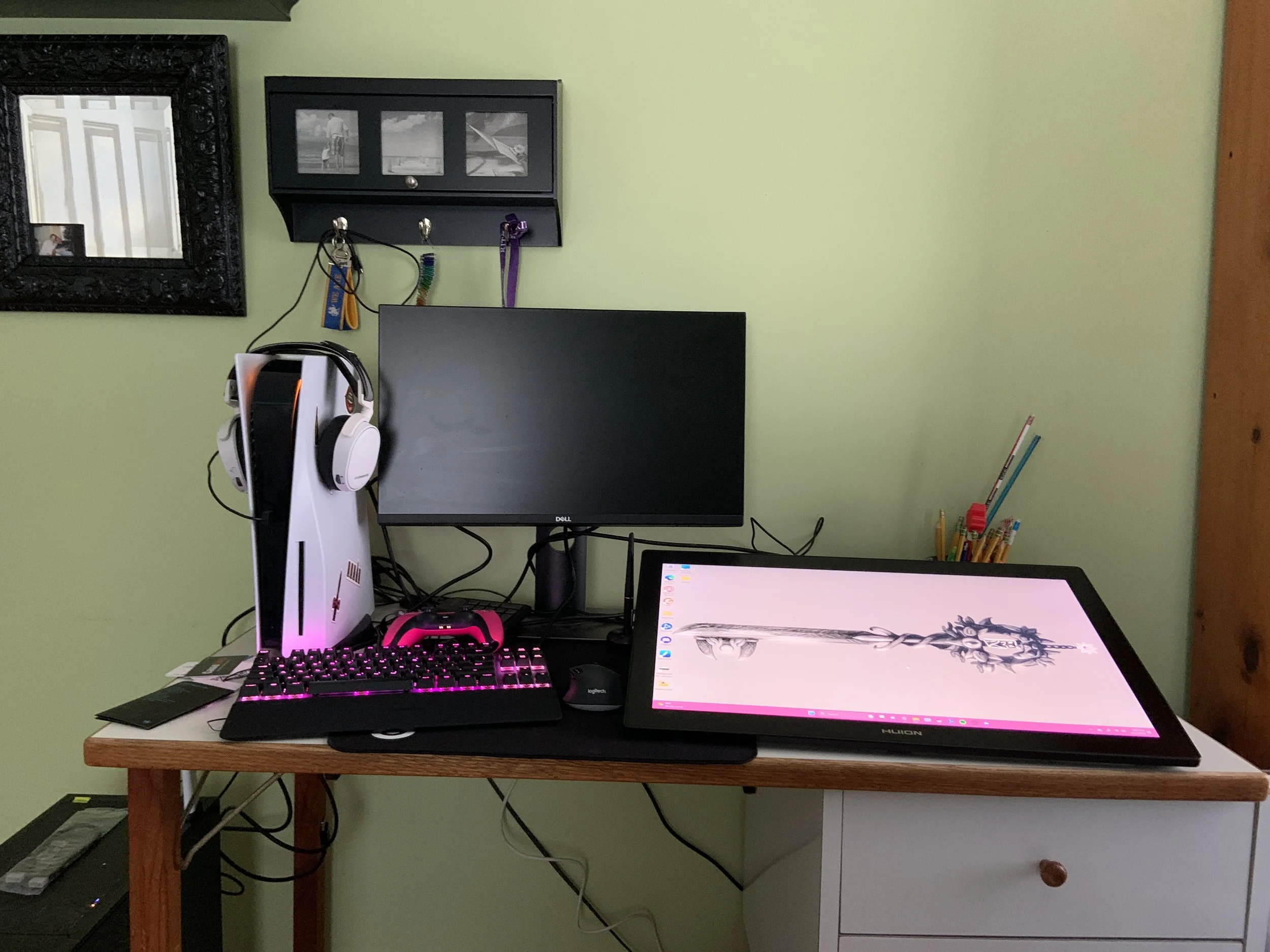 i have spent the past seven/eight years working digitally from surfaces that were smaller than or approximately the size of a magazine cover. my very first tablet was a screenless wacom intuit that i bought in 2015, and it was about ten inches diagonal. in 2019, i was due for a new laptop since my old one had begun to break, and i moved to a thirteen inch surface pro 6, which is what i’ve been using for my digital work the past four years. since then, however, it has begun to slow down, which was not good for some of the bigger pieces i needed to make. while it’s true i could’ve gotten the parts replaced or repaired, i’d been thinking about getting a pc for years since it would simply be better for my line of work, and i felt i was getting to a level of artistic skill that i believe warranted some excellent quality tools. with some assistance from friends and my father, i bought the parts and built the pc myself this past week—big tablet included! while i am currently waiting on one more piece, it’s not a necessary piece for the pc to run right now, but it will be necessary to run a dual-screen setup with my tablet screen and normal desktop monitor. from these hints, can you guess what piece is missing?